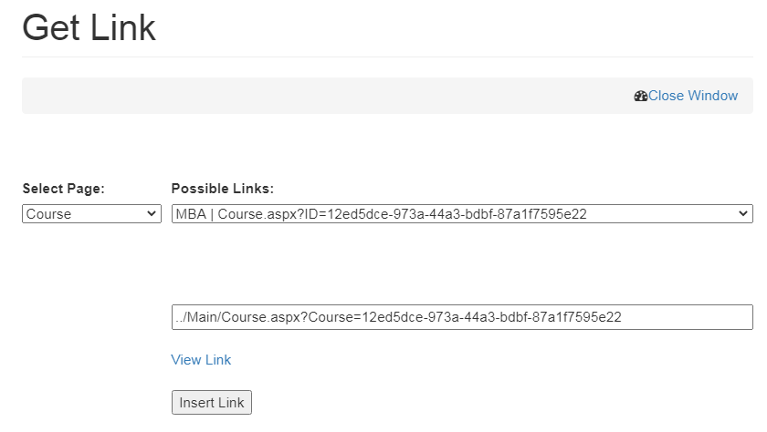 - Click on Get Local link, select Course/ Course List from the select Page drop down menu and click on Insert Link.