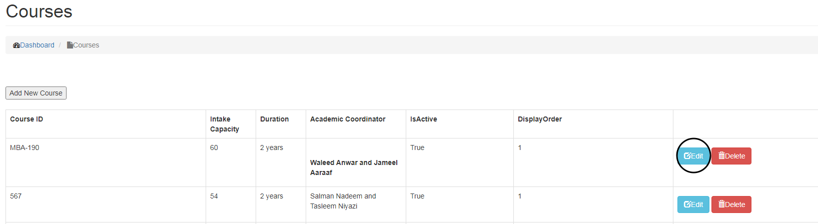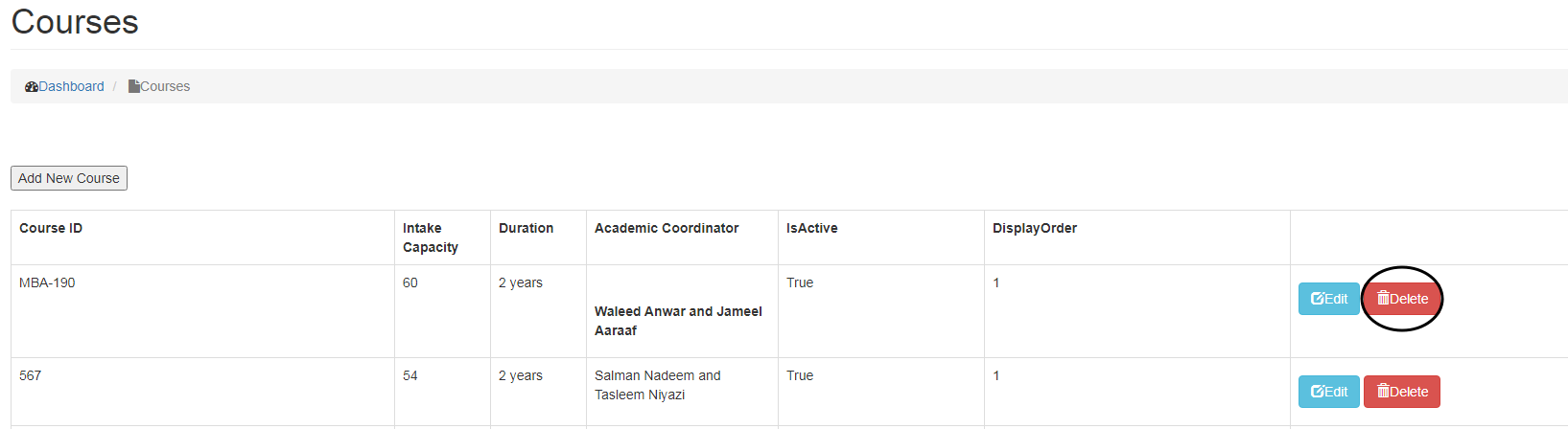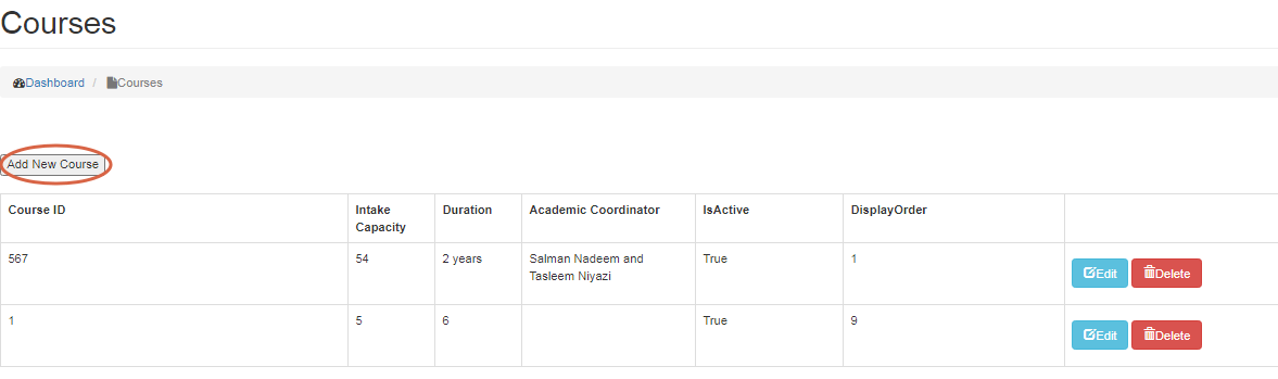 - To Delete a course, click on Delete button.