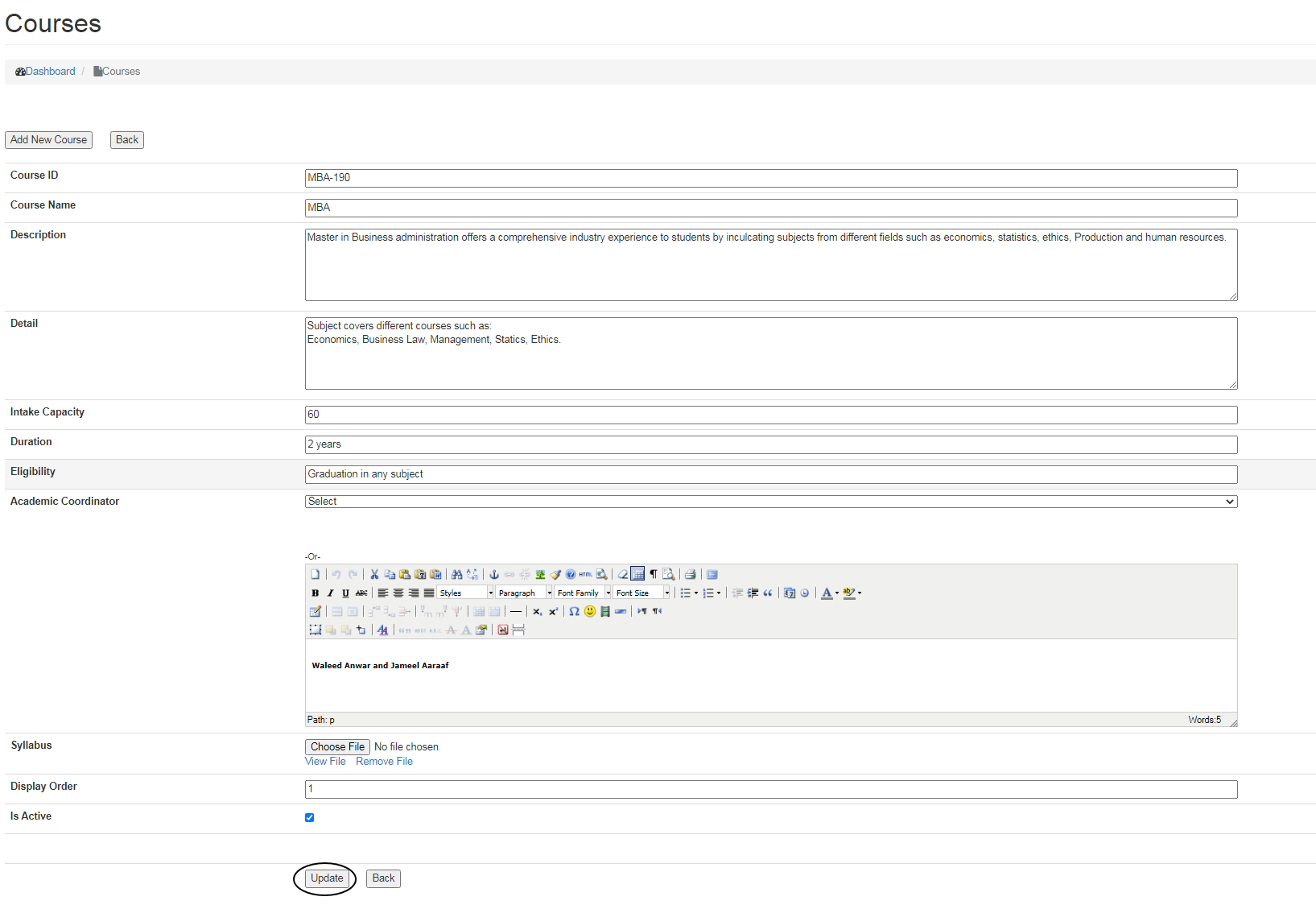 Course is a Programme of education leading to a Degree or Diploma. In this section, a user can update the course details, mention all the information which is required for the student to know all the details about the programme.