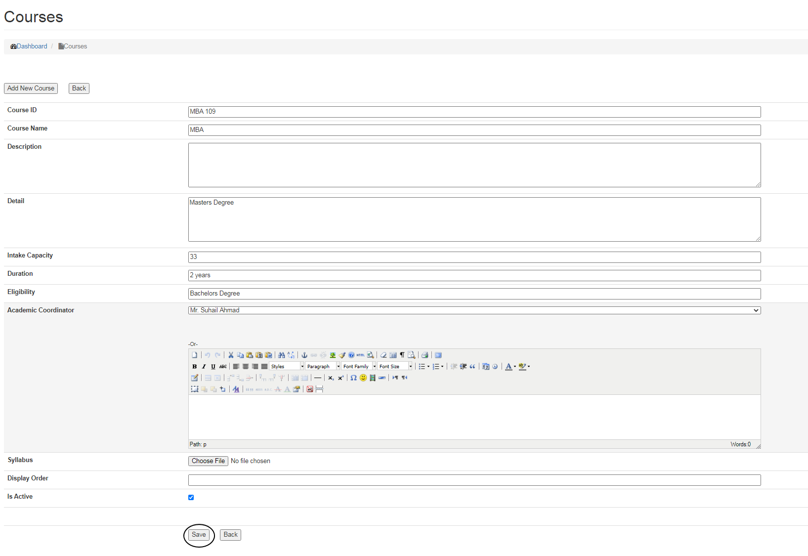 Once clicked on Add New Course button, it will take you to the page wherein you can enter course details which includes: