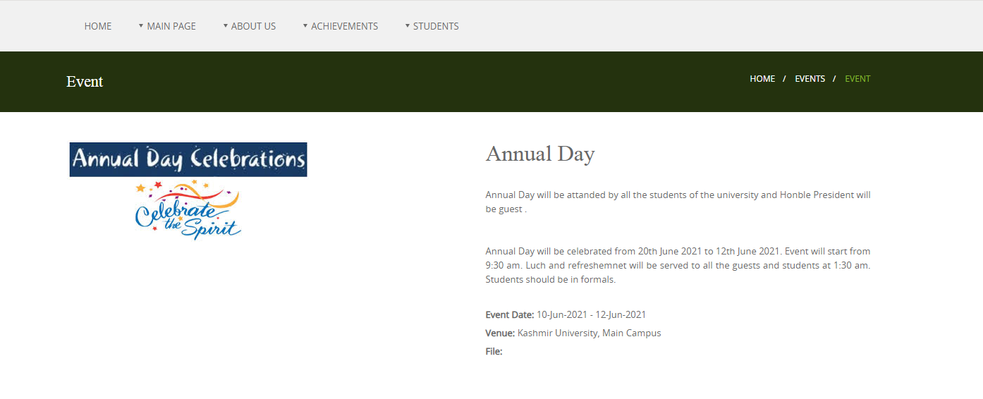 Screenshot showing an Event by the name Annual Day has been created on the website.