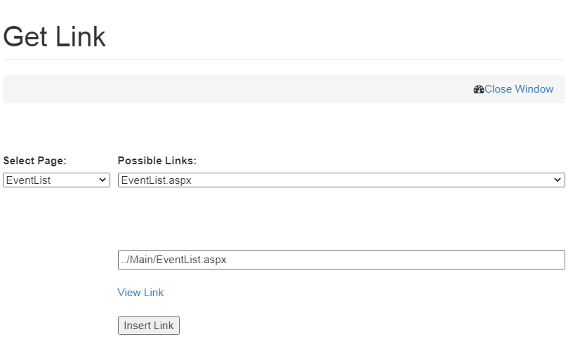 - Click on Get Local link, select Event List/Event view from the select Page drop down menu and click on Insert Link.