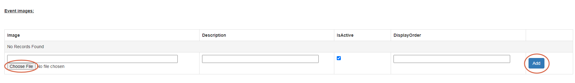 Once you have saved an event, Event Images table will appear beneath event details, wherein you can upload pictures of the event.