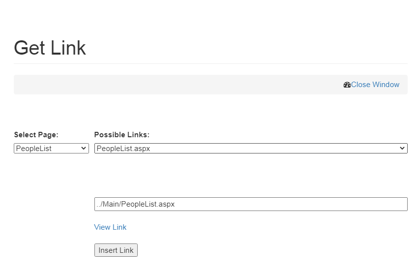 - Click on Get Local link, select People List/Profile from the select Page drop down menu and click on Insert Link.
